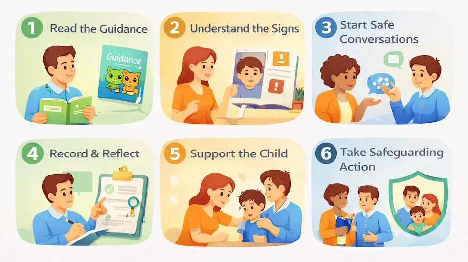 The Guy & Cesar adult toolkit follows a clear six-step safeguarding process. As a result, it helps parents, teachers, and professionals recognise concerns, support children, and take appropriate safeguarding action. These toolkits also support the safeguarding conversations introduced through the Guy & Cesar storybooks used by parents and schools.